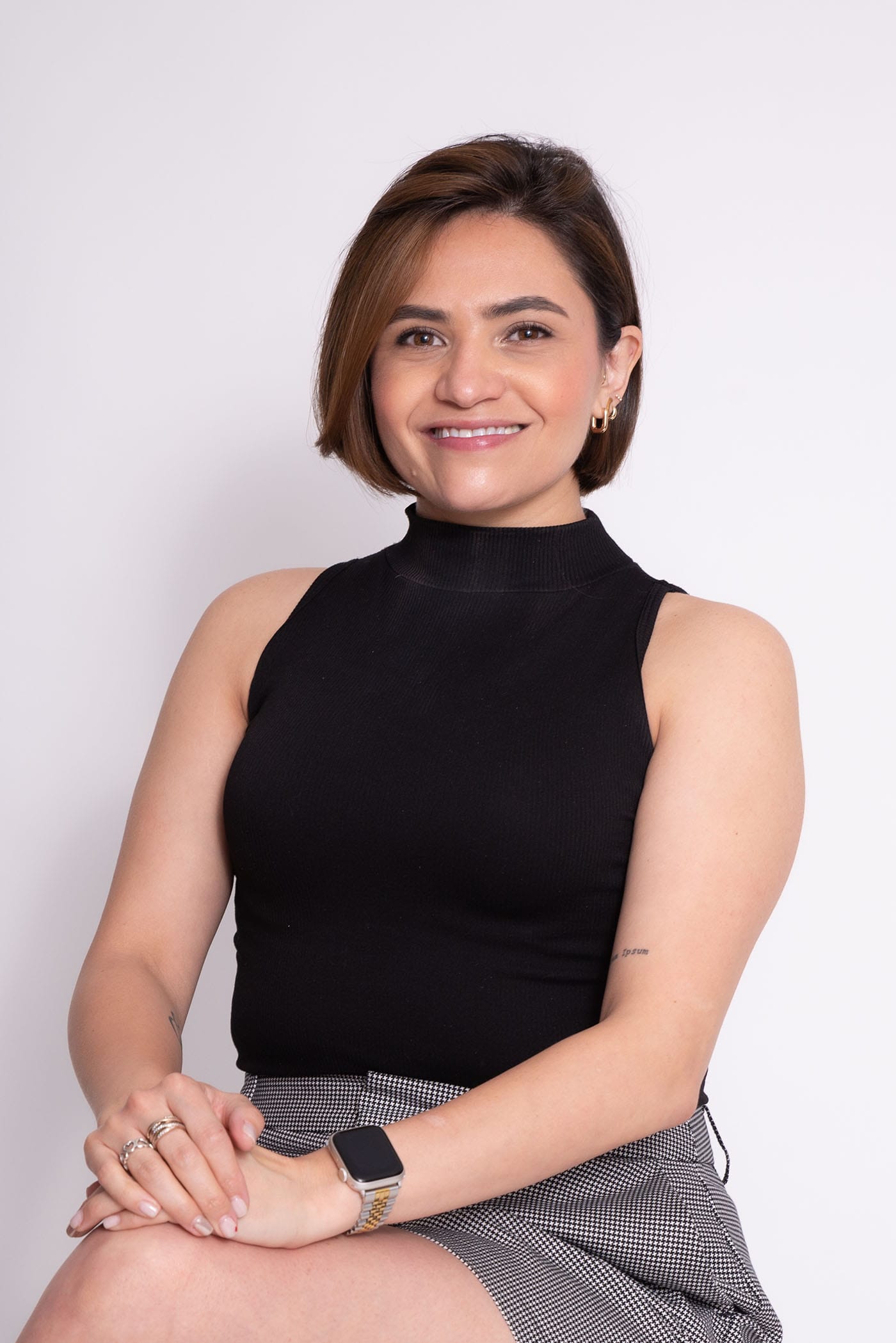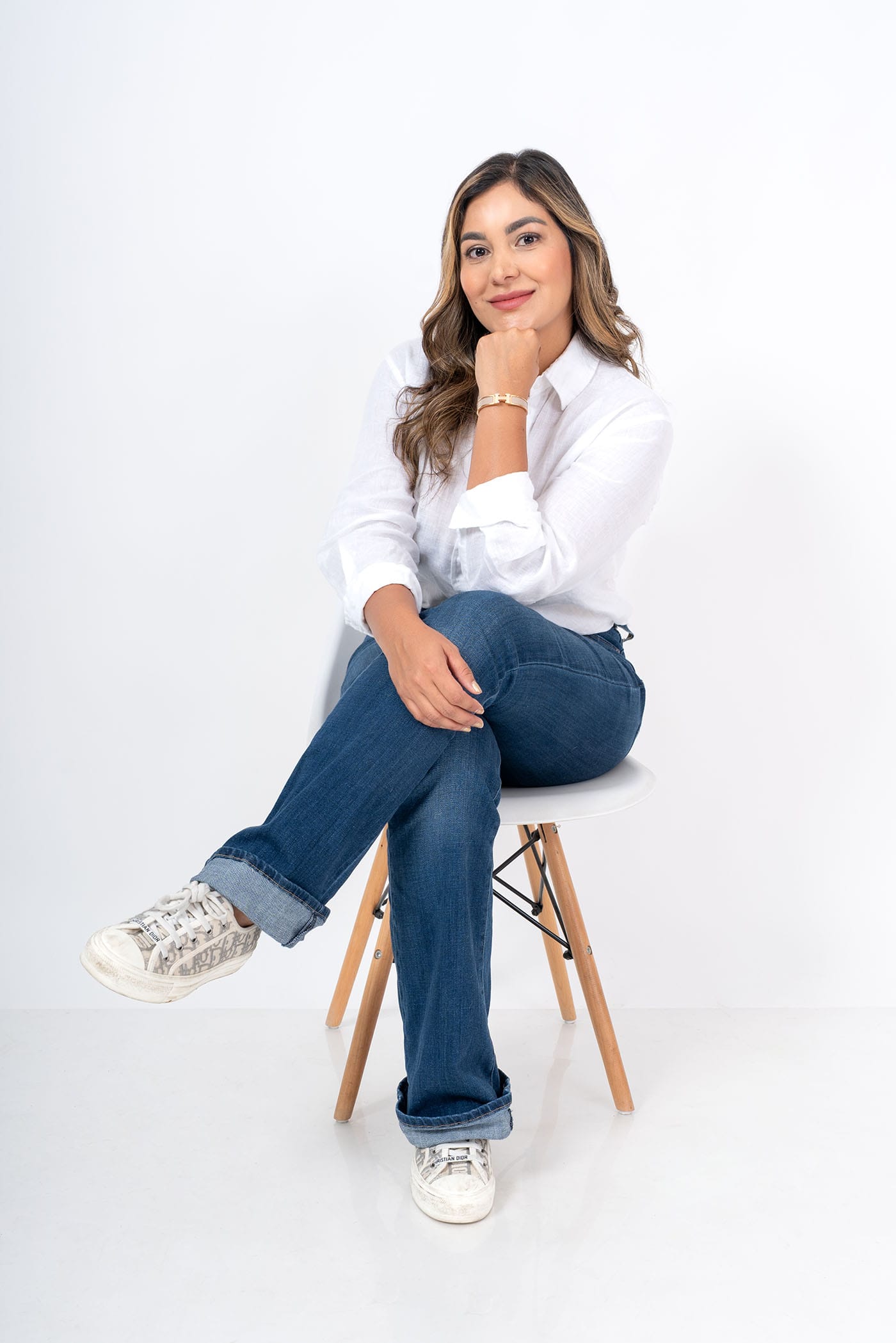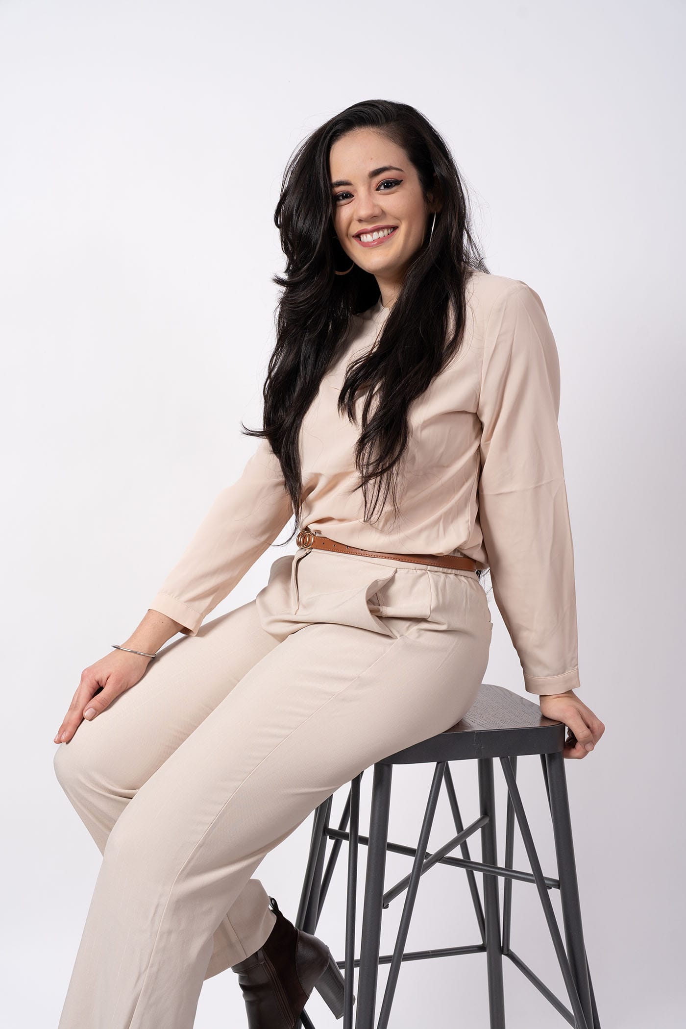 Fotografía profesional femenina en entorno neutro