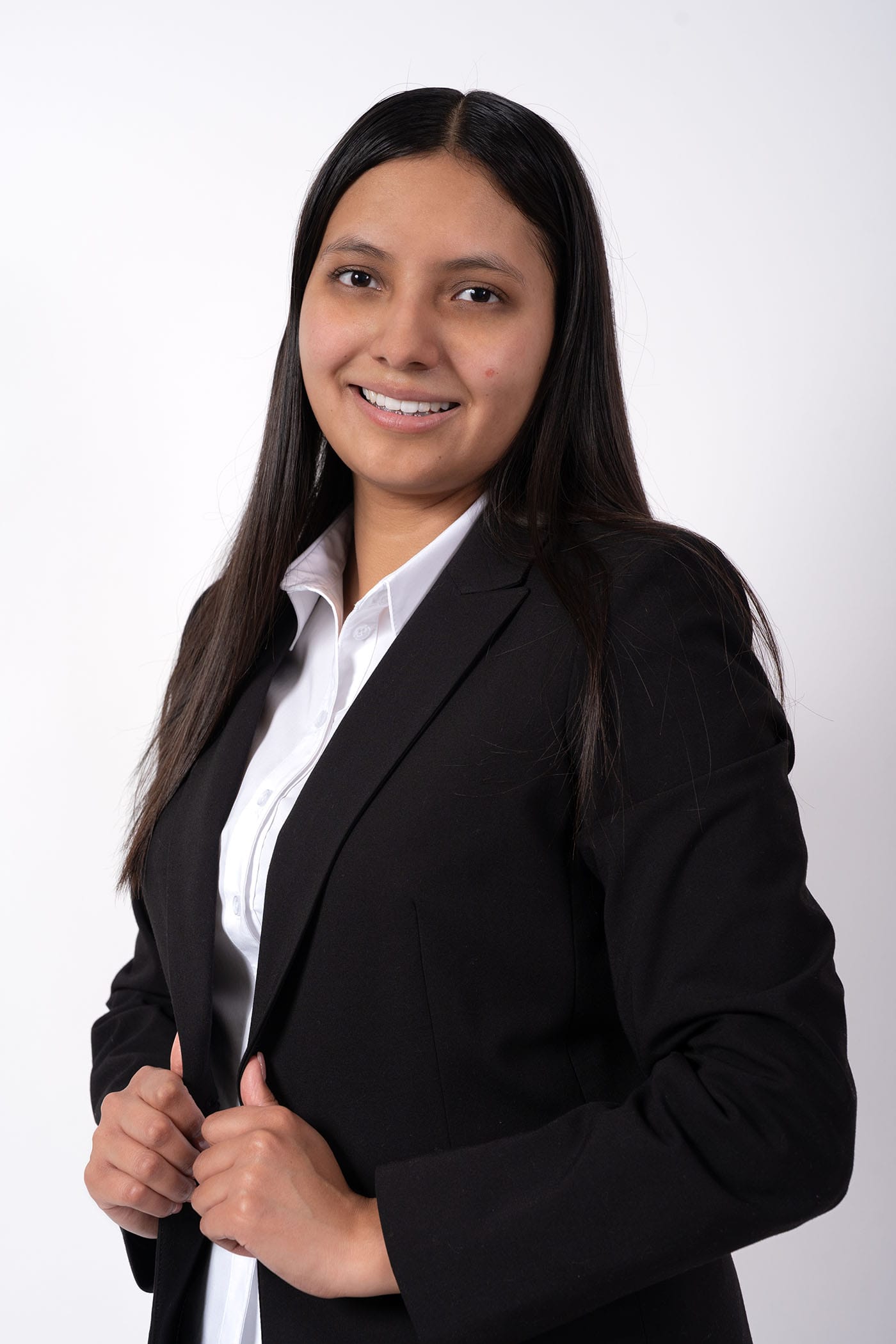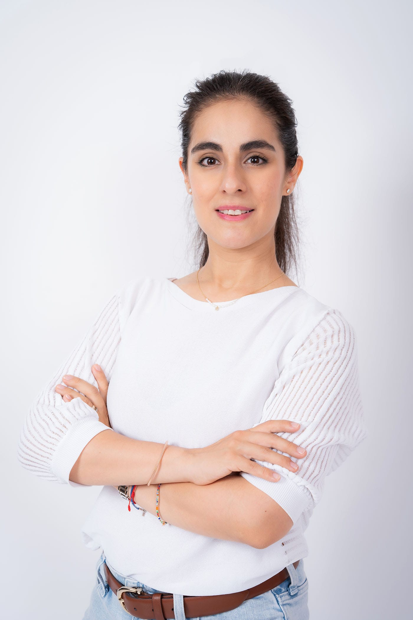 Retrato profesional femenino en estudio con fondo blanco